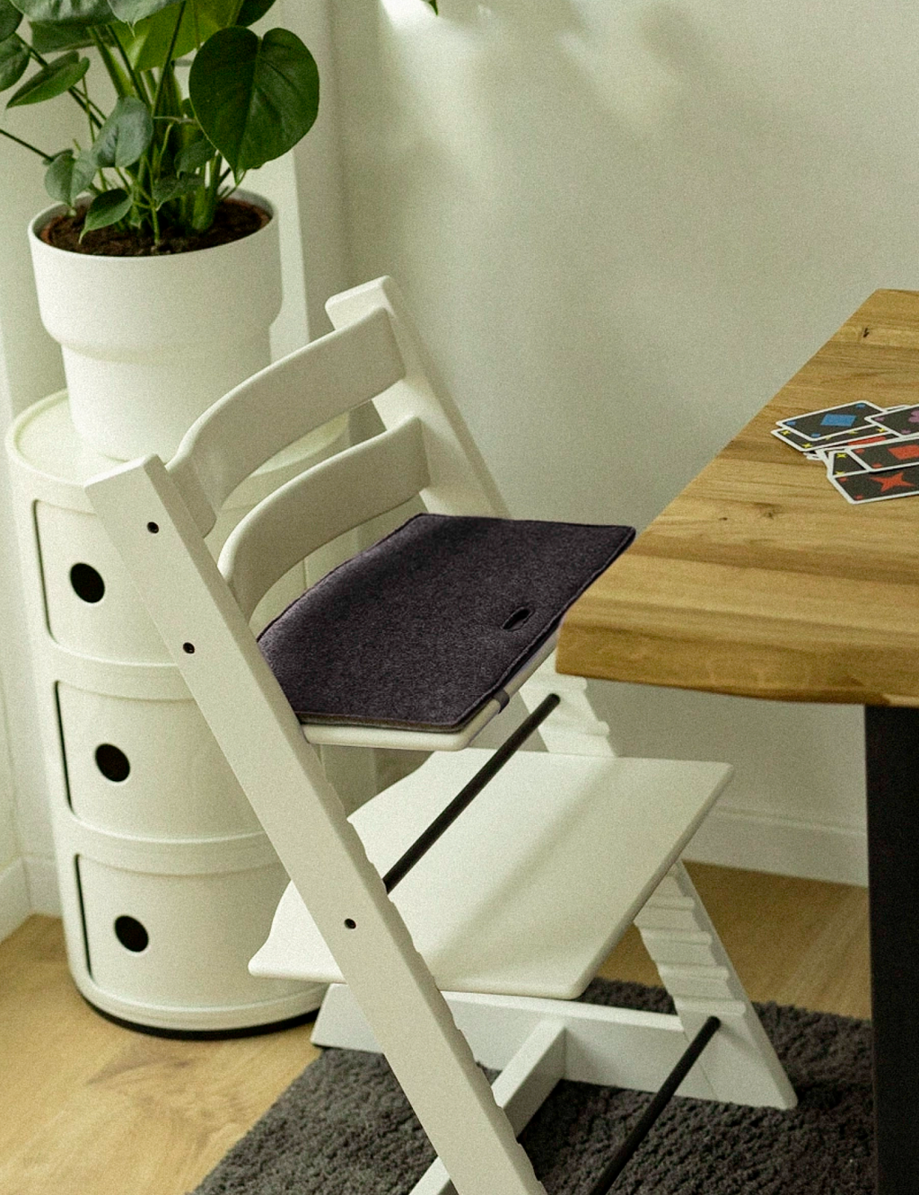 Verleihen Sie Ihrem Stokke Tripp Trapp Hochstuhl mit unserem Hochstuhl Sitzkissen einen Hauch von Komfort und Stil. Dieses bicolore Wendekissen ist speziell für den Tripp Trapp Hochstuhl von Stokke gefertigt und bietet eine perfekte Passform sowie ultimatives Sitzvergnügen für Ihr Kind. Hergestellt aus hochwertigem Wollfilz dieses Sitzkissen nicht nur umweltfreundlich, sondern auch besonders robust und langlebig. Die 5mm Filzstärke aus beiden Seiten sorgt für zusätzlichen Komfort während des Sitzens. Die praktische Pflegeleichtigkeit dieses Sitzkissens ermöglicht eine einfache Reinigung bei 30°C in der Waschmaschine, sodass Flecken kein Problem mehr darstellen. Die hellgraue Wendeseite des Kissens bietet zudem eine zusätzliche Farboption für verschiedene Stilvorlieben. Dank des rutschfesten Steckverschlusses ist das Sitzkissen sicher und fest am Stuhl angebracht, sodass sich Ihr kleiner Wirbelwind frei bewegen kann, ohne dass das Kissen verrutscht. Jedes Sitzkissen wird sorgfältig von Hand in Deutschland gefertigt, um höchste Qualität und Liebe zum Detail zu gewährleisten. Nur das Beste für Ihr Kind! Erweitern Sie die Funktionalität und den Komfort Ihres Stokke Tripp Trapp Hochstuhls mit unserer Sitzauflage - eine perfekte Kombination aus Stil, Komfort und Nachhaltigkeit.